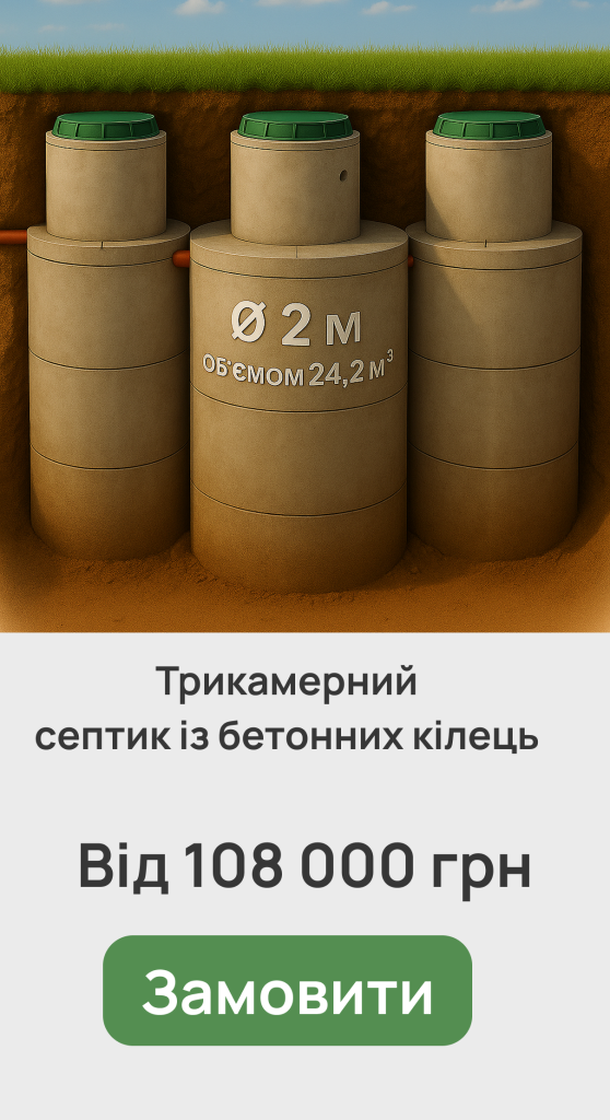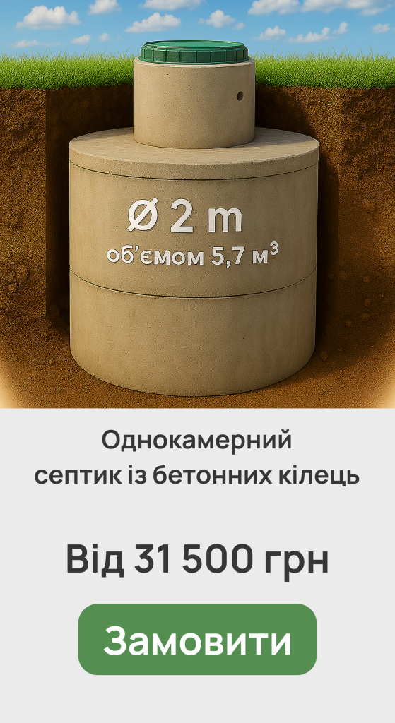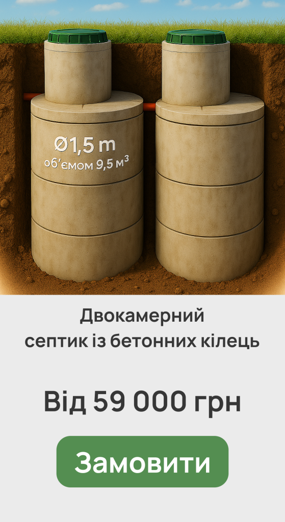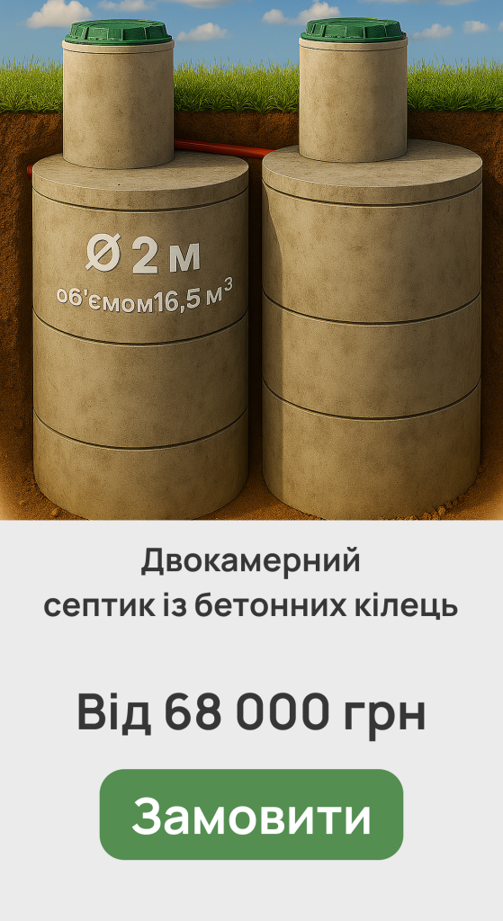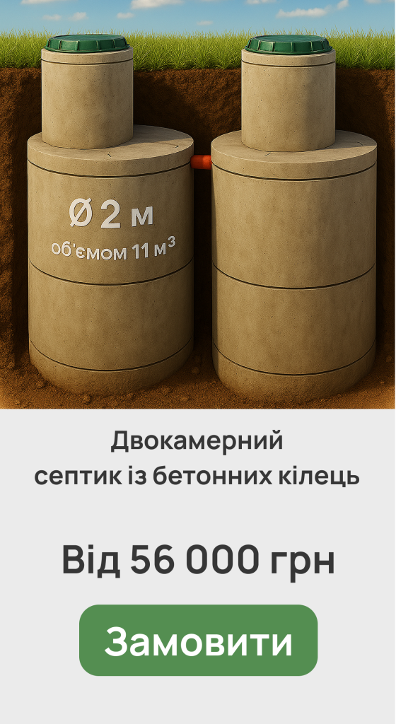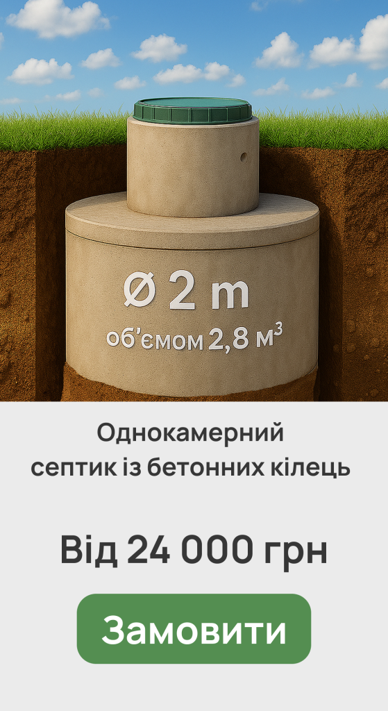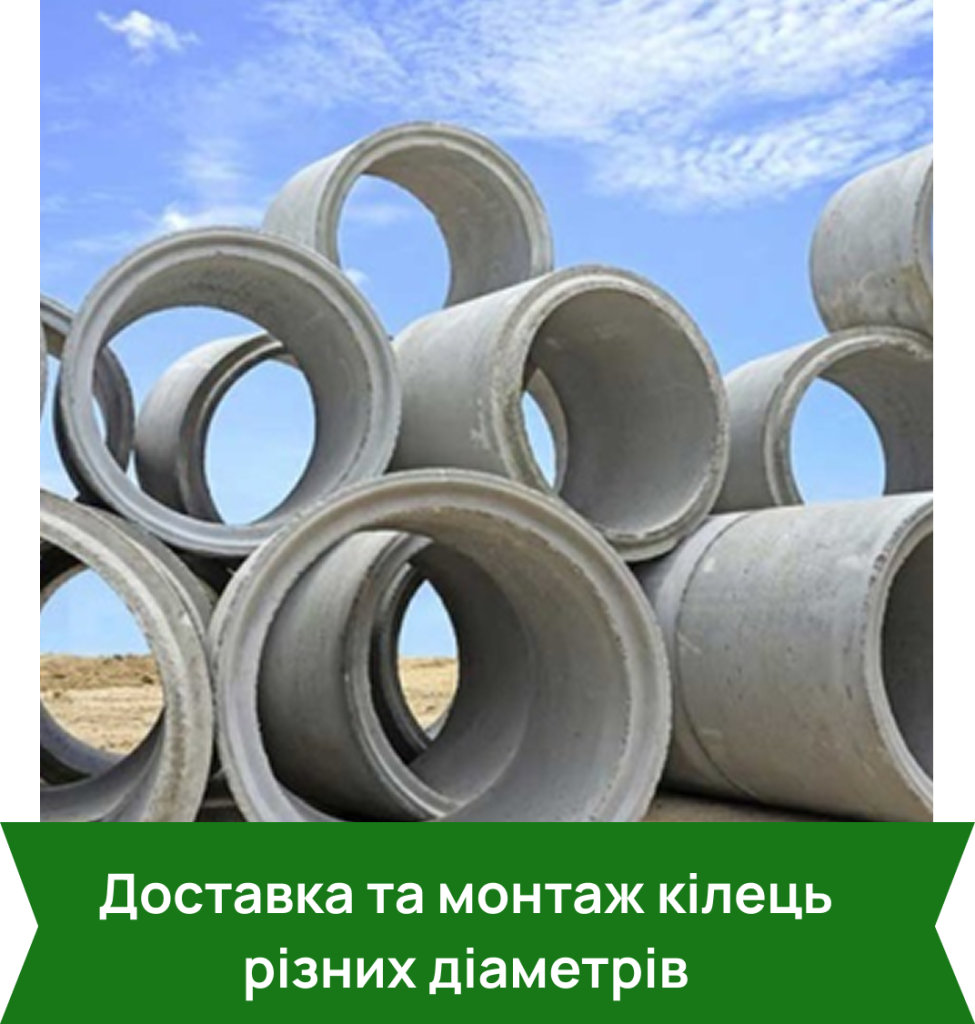 Наша компанія пропонує облаштування каналізації, установку септиків під ключ. Звертаючись до нас, Ви отримуєте високу якість і доступні ціни, адже ми маємо власне виробництво бетонних кілець, а також парк автомобілів для транспортування, обладнаних кранами для розвантаження і завантаження.