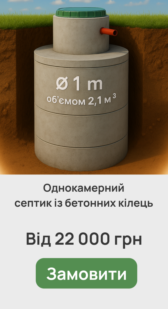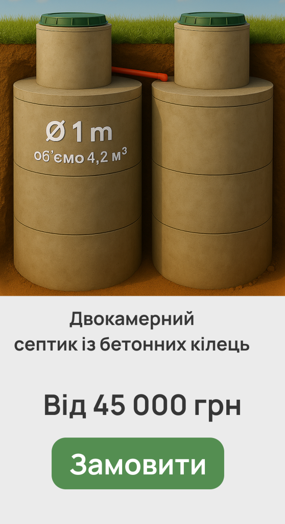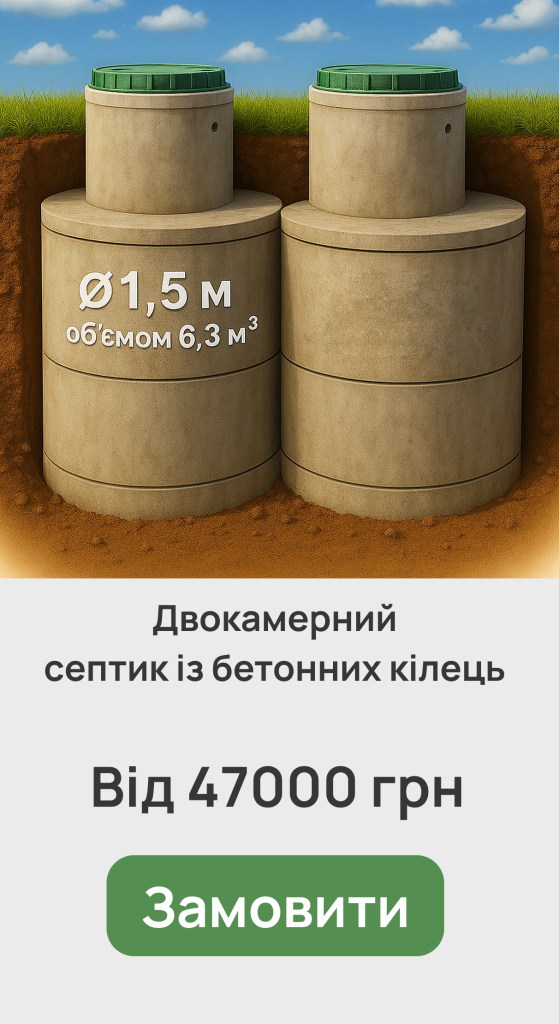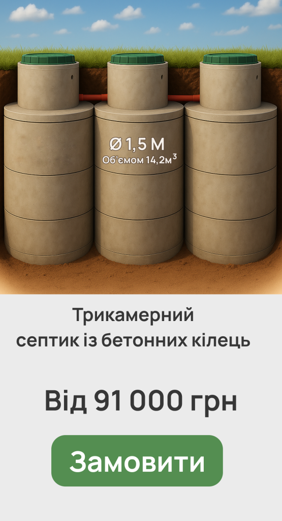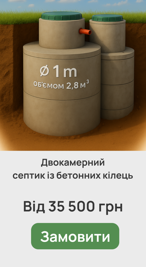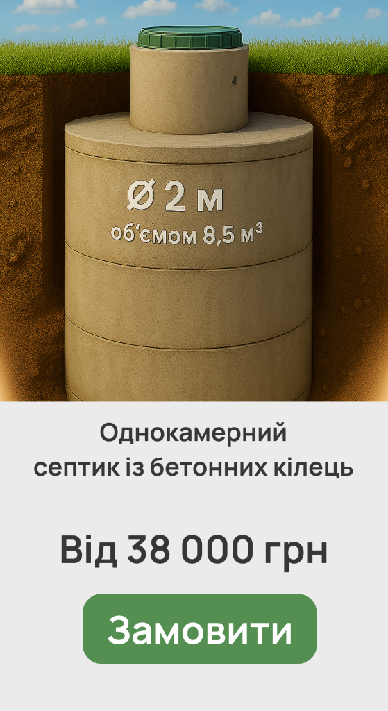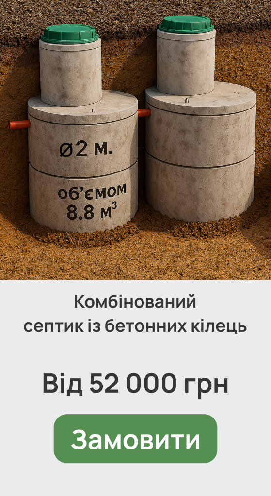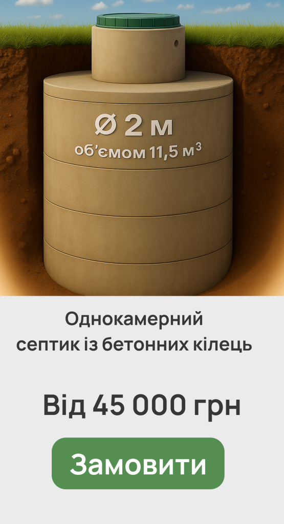 Наша компанія пропонує облаштування каналізації, установку септиків під ключ. Звертаючись до нас, Ви отримуєте високу якість і доступні ціни, адже ми маємо власне виробництво бетонних кілець, а також парк автомобілів для транспортування, обладнаних кранами для розвантаження і завантаження.